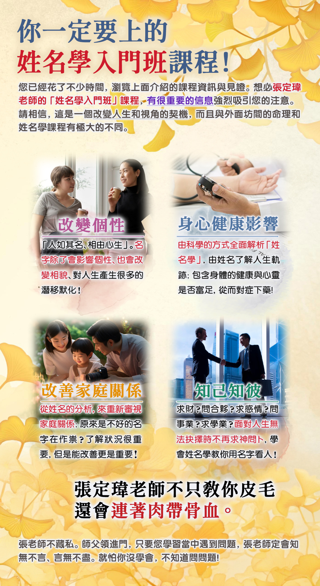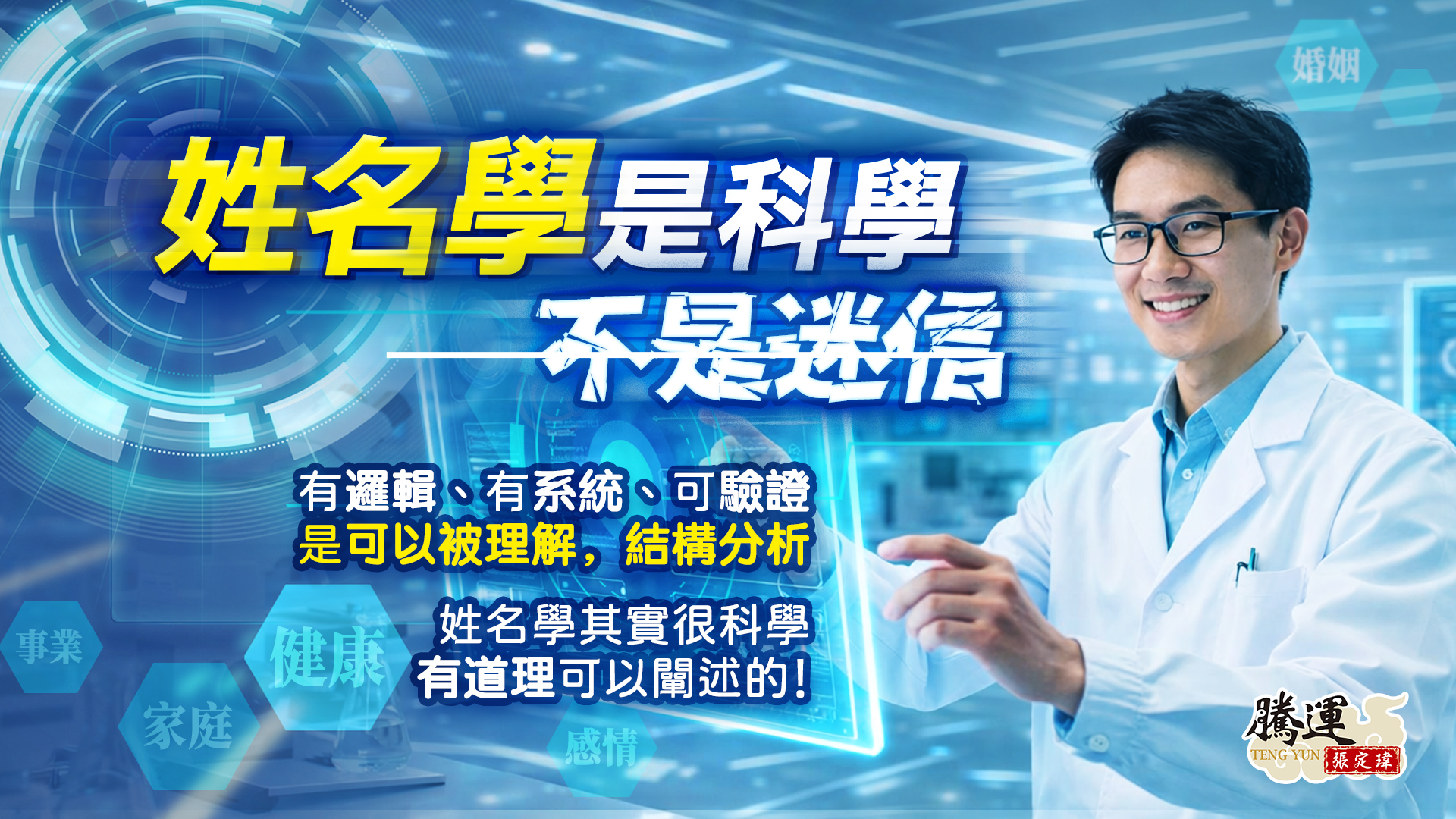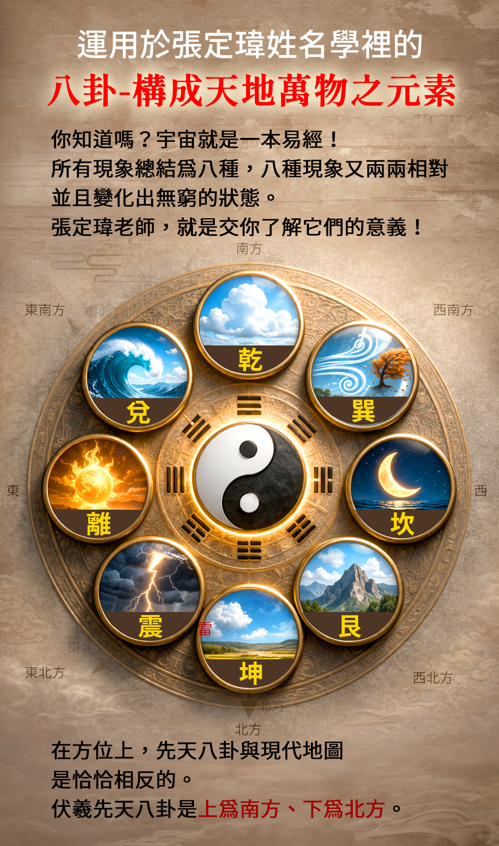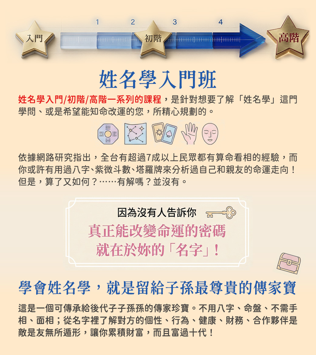 全球姓名學風水大師-張定瑋專研易經30年。取名超過100萬人。講座培訓超過500場,培訓的學生數千人。長期擔任電視台專業講師主持人25年至今。 也是中國唯一上衛星電視台最權威的易經大師! 天生八字命,其實名字才是你後天的運!姓名學入門班教你用名字看出自己的命運! 張定瑋老師就是用這套姓名學改善自己的命運,住300坪豪宅、家中的名車數輛,改善自己的命運就是這麼簡單!