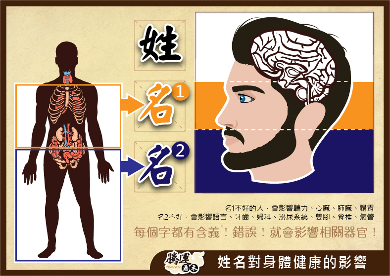? 名:除了代表人際關係貴人運、感情世界、事業工作錢財、最重要的也是代表健康,每個字都有所謂健康的含義!只要自己的變化錯誤,就會影響到器官的每個連結!