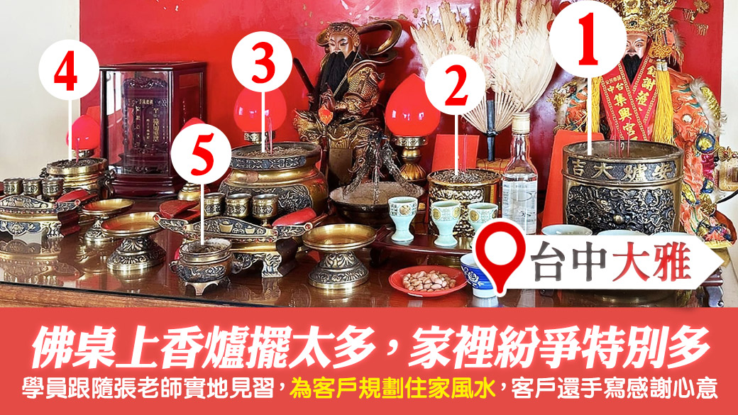 神桌上,只能有一個神明爐,太多爐這個家的分爭非常多。濟公的扇子是他的法器不可有爐~ 再加上神桌的正中間是神明爐,這也是不正確的,一輩子都在打拼江山給別人。左手事業右手錢財通通留不住。