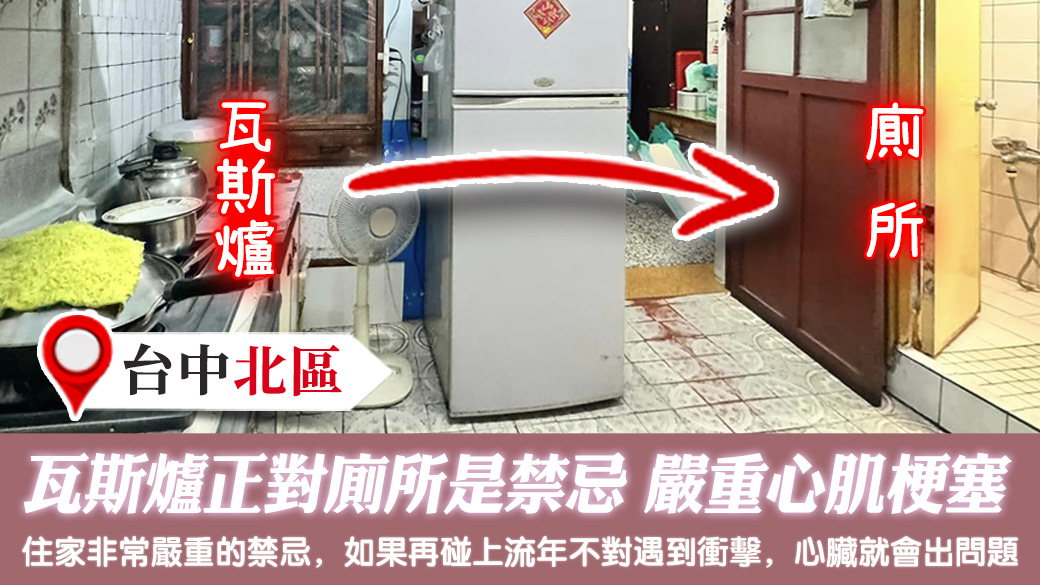 他們的瓦斯爐正對廁所,這是非常嚴重的禁忌也是很危險的事情,如果流年不對遇到衝擊,直接心臟就會出問題嚴重會有心肌梗塞~