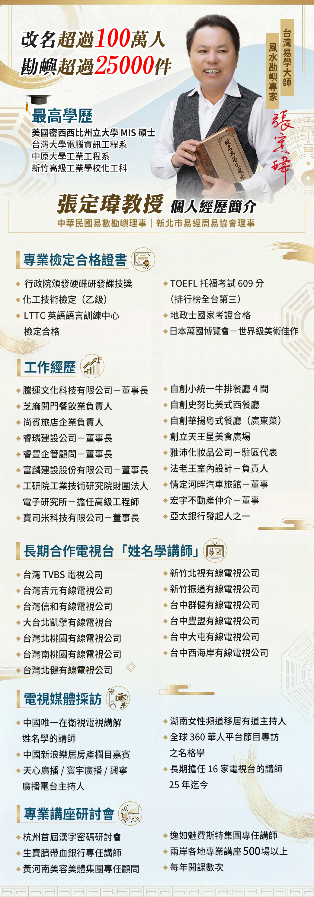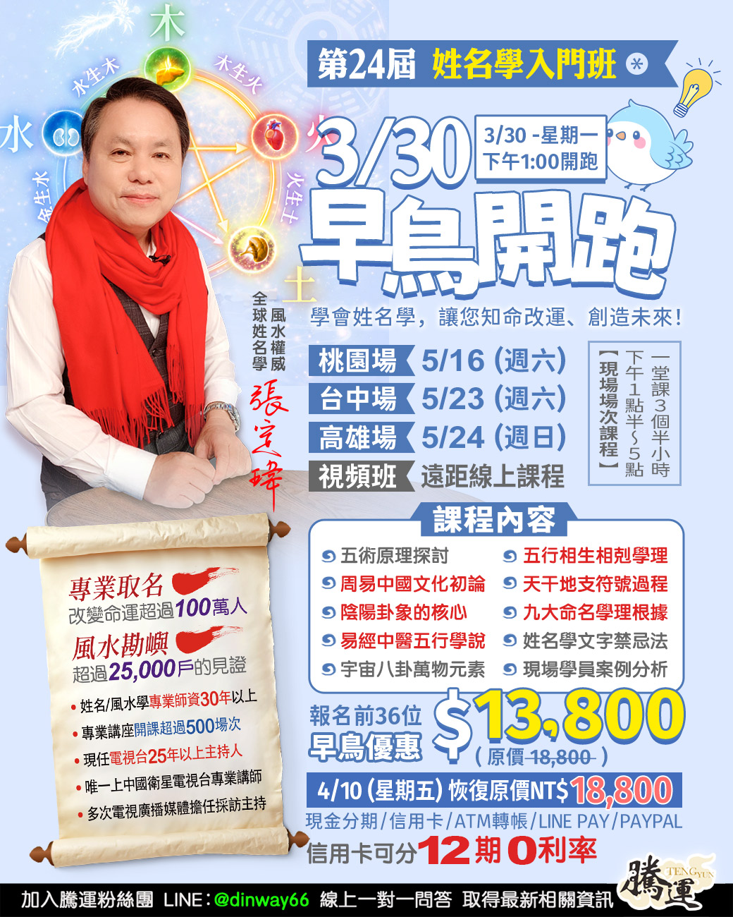 全球姓名學風水大師-張定瑋專研易經30年。取名超過100萬人。講座培訓超過500場,培訓的學生數千人。長期擔任電視台專業講師主持人25年至今。 也是中國唯一上衛星電視台最權威的易經大師! 天生八字命,其實名字才是你後天的運!姓名學入門班教你用名字看出自己的命運! 張定瑋老師就是用這套姓名學改善自己的命運,住300坪豪宅、家中的名車數輛,改善自己的命運就是這麼簡單!
